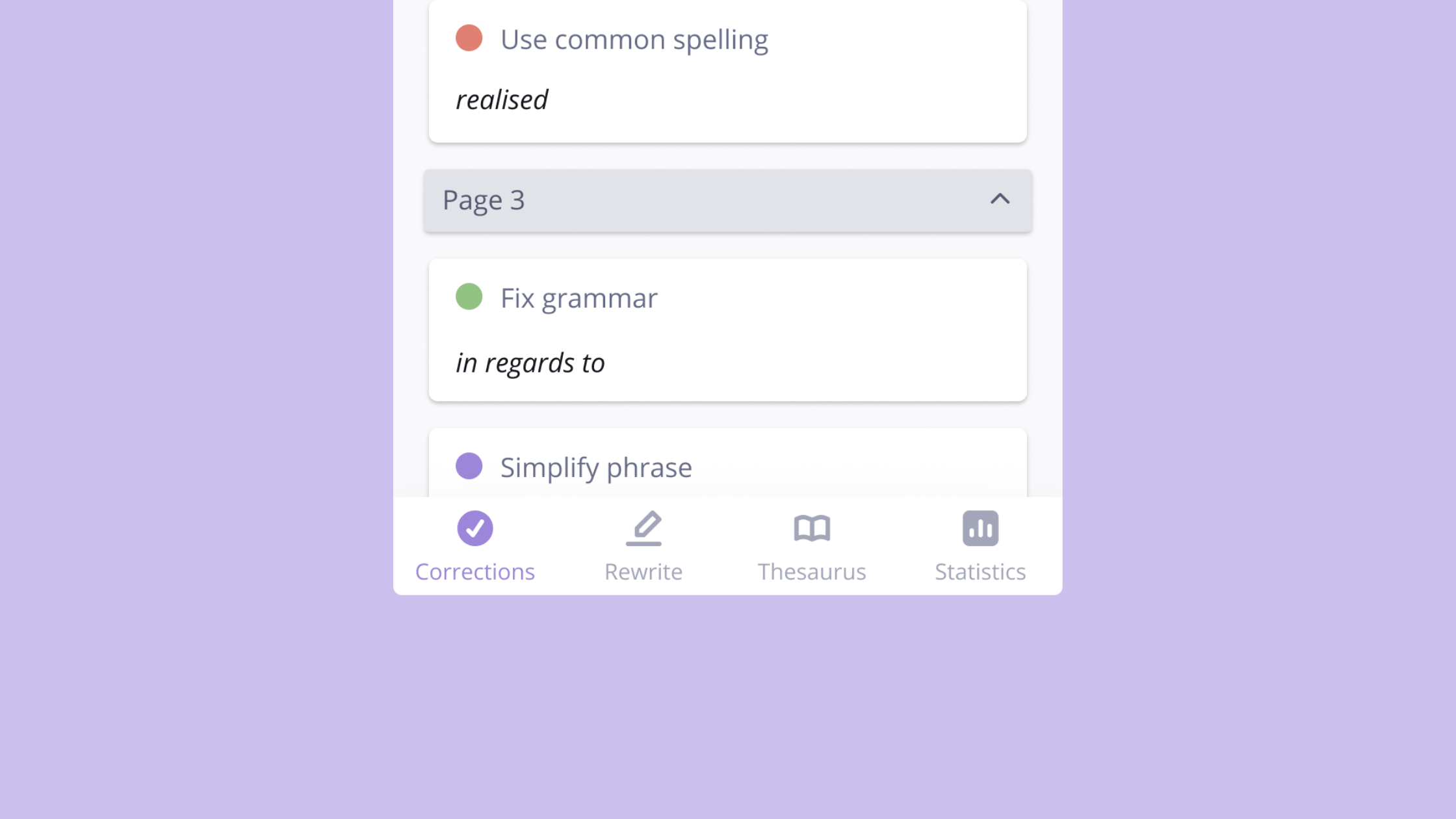 If Outwrite detects any grammar mistakes or style improvements, they'll show up here. Click on a suggestion to expand it, then click on an option to apply it to your document.